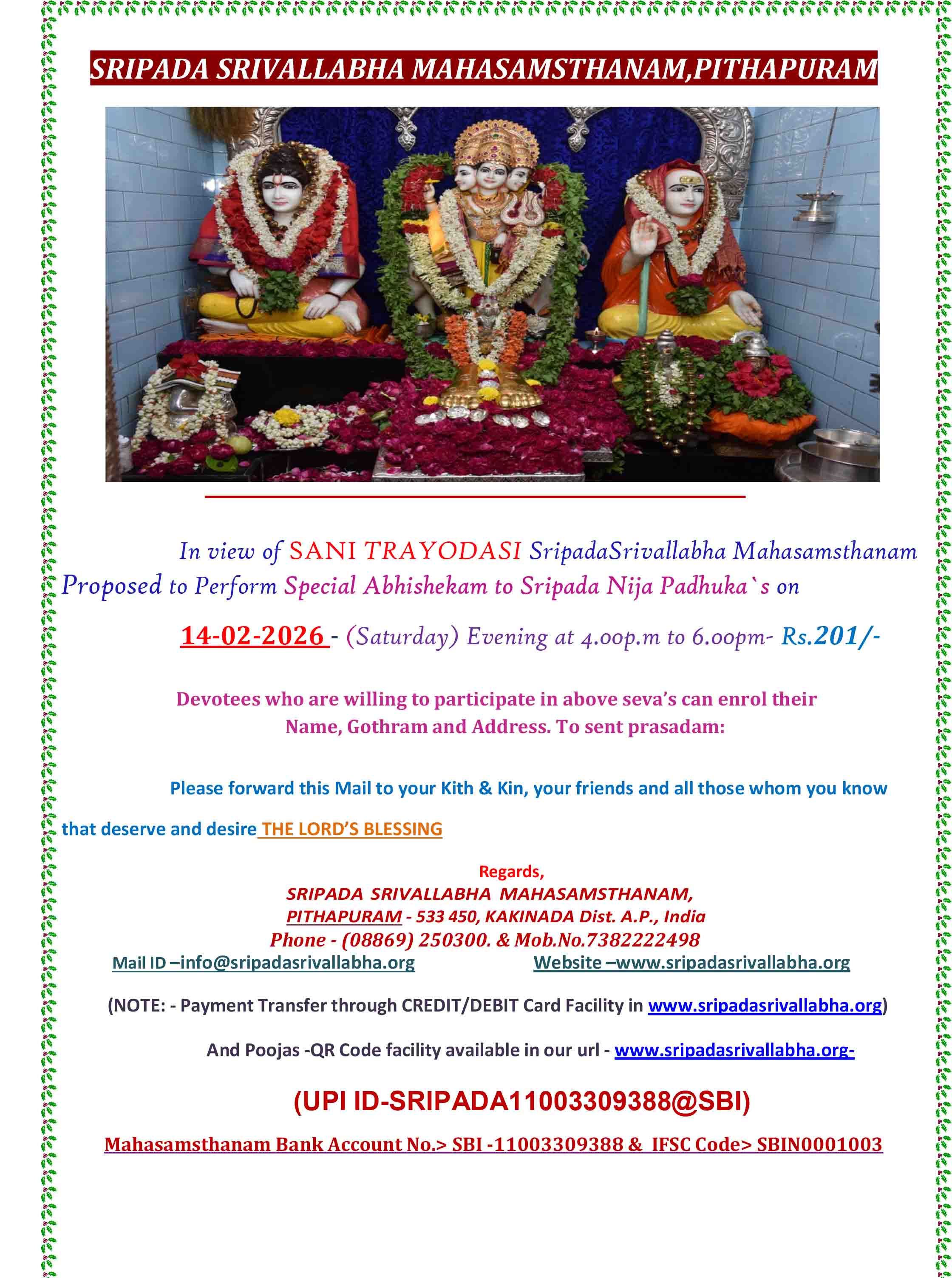 IMP Notice for Annadanam and Seva Donations: Due to technical issues in Online Payment System Devotees are requested to use the below QR CODE for Annadanam and Sevas. After Scanning the QR Code (Click on this message to get the QR Code), please send Payment Details Screenshot to info@sripadasrivallabha.org
